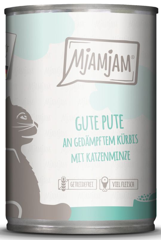 Zusammensetzung: Putenfleisch, ‑herz, ‑leber, ‑magen (ca. 68 %), Fleischbrühe (28 %), Kürbis (2,9 %), Mineralstoffe (1 %), Katzenminze (0,1 %).