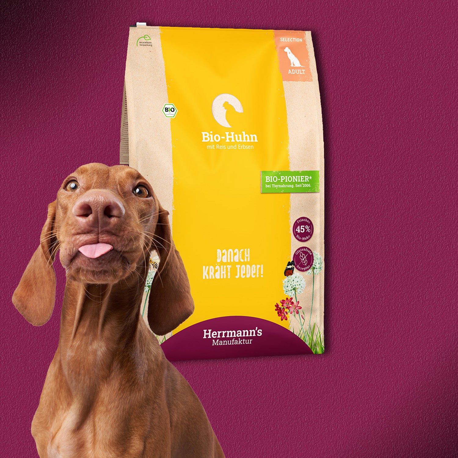 Herrmann's Bio-Huhn mit Reis & Erbsen enthält 45 % frisches Bio-Huhn als proteinreiche, leicht verdauliche Proteinquelle. Reis dient als schonende Kohlenhydratquelle, während Erbsen und Hafer wertvolle Ballaststoffe zur Unterstützung der Verdauung liefern. Ergänzt wird das Menü durch Sonnenblumenöl mit Omega-6-Fettsäuren für gesunde Haut und glänzendes Fell sowie Obst und Gemüse aus kontrolliert biologischem Anbau.