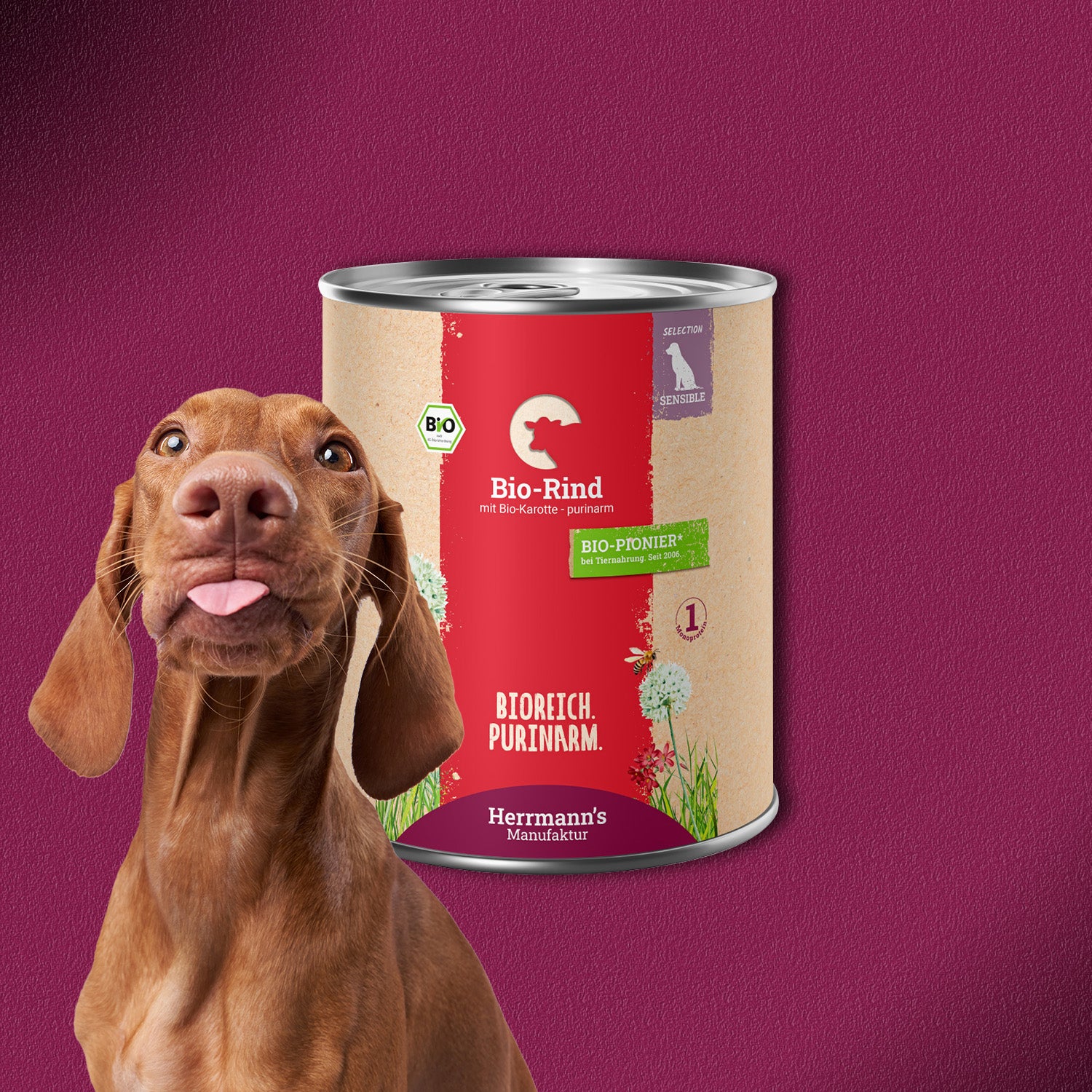 Herrmann's Bio-Rind mit Karotten – purinarm enthält 40 % frisches Bio-Rind als hochwertige, purinarme Proteinquelle. Zur Unterstützung einer angepassten Ernährung wird ausschließlich Muskelfleisch verwendet – keine Innereien. Ergänzt wird das Menü durch Süßkartoffel mit Kalium und Vitamin E, Hagebuttenpulver als Quelle wertvoller Antioxidantien sowie Brennnessel zur Unterstützung der Nierenfunktion. Eierschalenpulver sorgt für ein ausgewogenes Calcium-Phosphor-Verhältnis, während Knotentang Jod liefert.