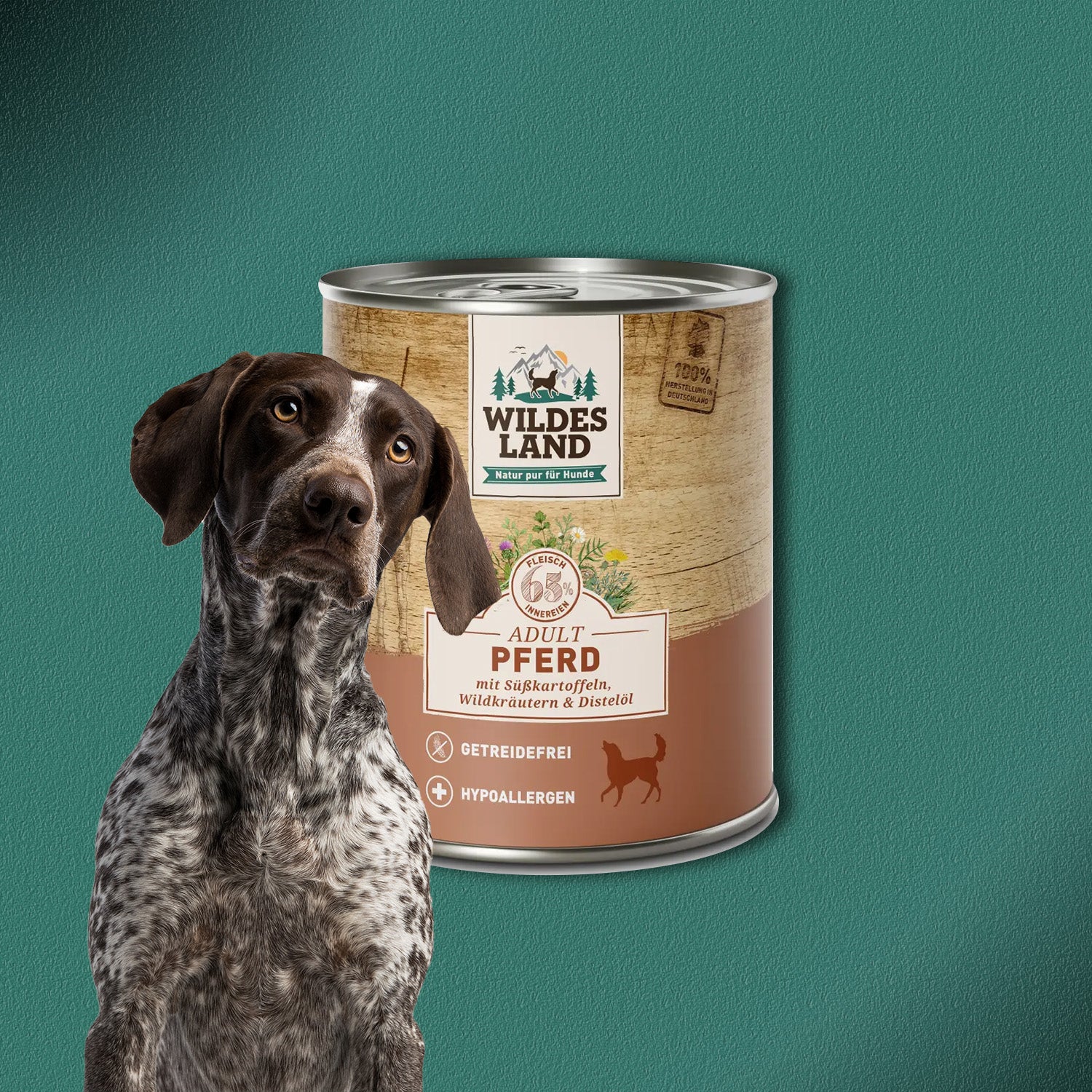 Für das Wohlbefinden und die Gesundheit deines Hundes ist eine ausgewogene Ernährung mit hochwertigen Proteinen unerlässlich. Das Nassfutter Pferd mit Süßkartoffeln, Wildkräutern & Distelöl von Wildes Land bietet eine artgerechte, getreidefreie Ernährung und ist durch die Monoprotein-Rezeptur besonders verträglich und hypoallergen – ideal auch für sensible Hunde.